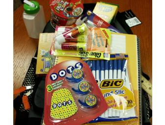 Boys black backpack filled with 6 spiral notebooks, drink container, Fruit loops, pkg. of ballpoint pens, ruler, Crayola crayons, markers, glue sticks, pencils, note pad, & Fiskars scissors.