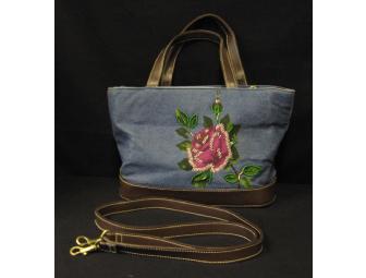This adorable denim handbag is fully lined with a center zipper compartment and side zipper compartment. It also has a separate pouch for your cell phone. Also included is a removeable shoulder strap.