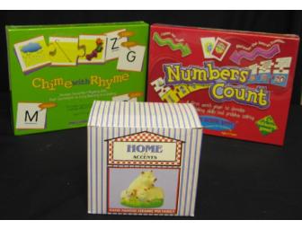 "Numbers Count" is a first math game to develop critical thinking skills and problem solving. "Chime with Rhyme" is a game to develop important rhyming skills that contribute to early reading and spelling. Also, a hand-painted ceramic Pig Family.