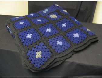 This lovely afghan measures 76" X 96" and is crocheted in shades of blue and black. It would be a beautiful addition to your home.