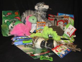 16 pack of Greenies; Safari Nail Trimmer; Vitakraft ChocoMilk Drops; Zanies Pet Toy Dinosaur; Vanilla flavored Yummie Balls; two Texas Taffies; three Second Wind Energy Snacks; Bully Weave Dog Treat; Moo Dog Chew; TBonz Sizzlin' Steak Flavor Snack; Self-cleaning Slicker by Evolution; Zanies Tug Toy; Fringe Benefits stuffed tiger; Peppermint Travel Set; Zanies stuffed bunny; Planet Dog Football.