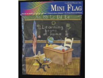 This flag is made by Custom Decor, Inc. and is 100% polyester and fade resistant. It reads "Learning begins at Home". It measures 12" Wide x 18" High.