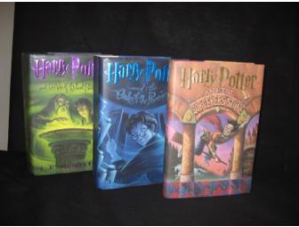 Three books by J. K. Rowling: Harry Potter and the Half-blook Prince; Harry Potter and the Order of the Phoenix; Harry Potter and the Sorcerer's Stone. These hardcover books are "gently used" and in nearly-new condition.