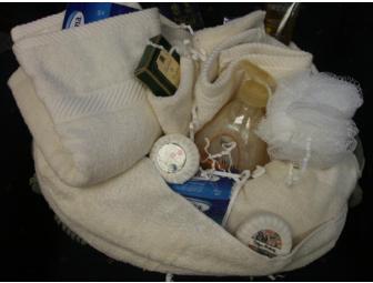 Large basket filled with bath towel, hand towel, wash cloths, soaps, Neutrogena Shower & Bath Gel, Lily of the Valley Talcum Powder, assorted soaps, & Mango Body Wash.