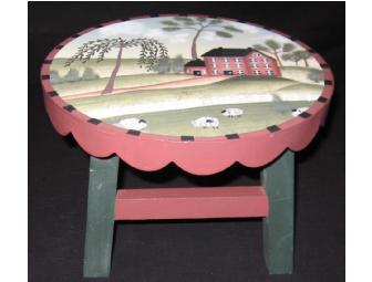 This charming wooden stool is hand-painted with a quiet country scene with rolling hill, sheep, and a farm house. The edges of the stool are scalloped. The stool is 10 inches in diameter and stands 6 1/2 inches high.