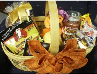 Large basket filled with 4 bags of candy, 1 large Ghirardelli Bar of chocolate, Yankee Candle -"Autume Wreath" potpouri & large housewarmer candle, Ceramic Pumpkin & orange Beanie Baby.
