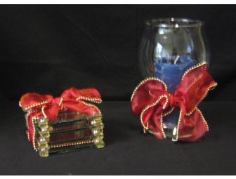 Four clear glass coasters (footed) and a clear glass candle holder with red candle, both decorated with a red bow for the holidays.