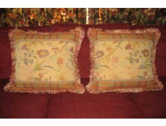 2 24 x 24 Hand Made Decorative Pillows in Raspberry, Green, Gold Plaid with Floral Tapestry Insert