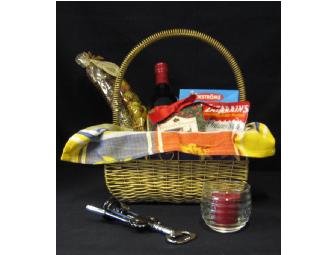 Gold basket filled with: Spiced Apple Cider Drink Mix; Cinnamon Scented Candle in Glass Holder; Sangria; Zatarain's Rice; Knorr Mix for Chicken Dijonnaise; Swedish Blueferry Soup Mix; Panhandler Pasta; Cork Screw, and the basket is lined with a removeable country design napkin.