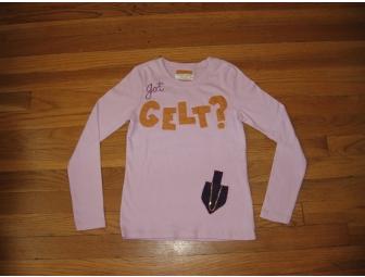 Great Hanukah gift for that special little girl... 100% cotton long sleeved lavender t shirt w/the words got gelt? hand cut out of golden felt & hand sewn onto the tee, embellished w/ a hand cut purple felt dreidel and hand sewn onto the tee as well. size 8