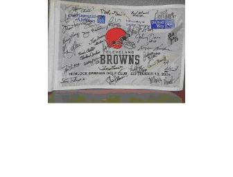 A "must have" for the loyalist Browns fan. Golf pin flag autographed by former Browns players including Reggie Rucker, Kevin Mack, Cody Reisen, Leroy Hoard and others.