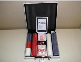 This boxed set includes two decks of playing cards, three colors of chips, and five dice.