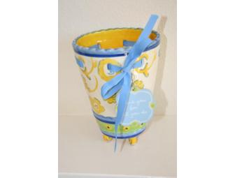 This lovely blue and yellow container can be used as a vase, planter - or just use your imagination. A wonderful gift.
