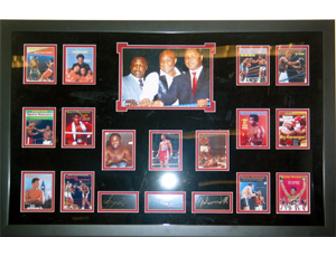 Joe Frazier, Muhammed Ali, and George Forman Framed Photograph with Golden Signatures and replica Sports Illustrated Covers.