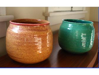 Both stand 6-1/2" tall. Glazes are mottled mustard yellow with a rose overglaze, and seafoam blue with a celedon green overglaze.
