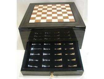 Handcrafted Piano Finish game set, includes backgammon top and chess playing top. Pull Out drawer neatly stores all chess pieces. Inside hinged lid compartment, sores all additional game pieces including, cards, dice, dominos, checker and chess pieces.