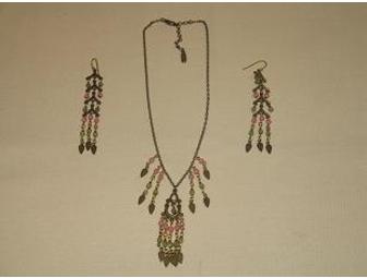 Matching Necklace and Tiered Earring Set designed by Ben Amun in Brass with delicate pink and sage green beading accents.