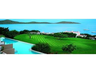 A trip for two to the Greek Isle of Crete. Includes a four-night stay at the luxurious Porto Elounda De Luxe Resort, located along the azure coast of Elounda, a resort designed to cover your every need. This trip includes round-trip airfare for two. Comes with a Tiffany Green Leather Bound World Atlas.