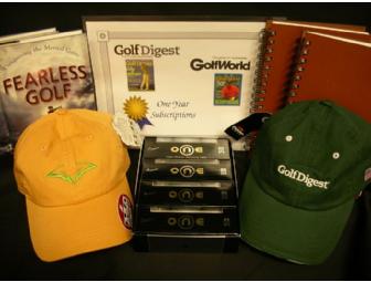 A one (1) year subscription to both the #1 golf publication, Golf Digest, and the game's #1 newsweekly, Golf World. You will also receive two (2) Golf Digest journals; two (2) "Fearless Golf" books by Dr. Gio Valiante & Mike Stachura; two (2) Golf Digest hats and one box of Nike Golf Balls. Everything a golfer could want!