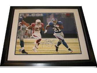 This framed photo autographed by Tiki Barber, Giants running back, is 20 1/2 by 24 1/2.