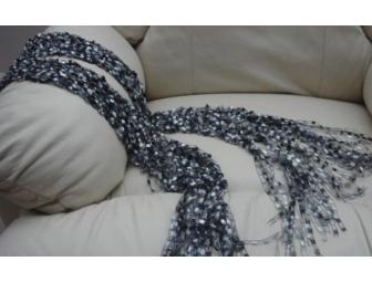 You won't believe how delicate and elegant this handmade scarf is! Crocheted from black and silver ribbon. About 4" wide and 60" long, including fringe.