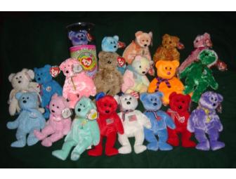 20 Current and retired Ty Beanie Baby bears. Mint condition, with tag protector. Includes Ariel, 2002 Holiday, Pinta, Teddy, Harry, Smitten, Mellow, Addison, Herald, Red America, White America, Blue America, Shivers, Sherbet, Eggs III, Baby Girl, Baby Boy, Secret, Dearest, Clubby IV (in original packaging).