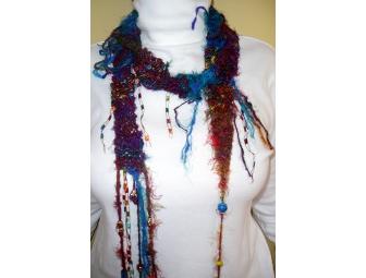 A beautiful southwesterny-looking scarf with earthy colors of yarn. Turquoise and sea blue, purples, rust, moss green, orange and gold yarns and threads with same hued beads woven in. The scarf is about 6 feet long.