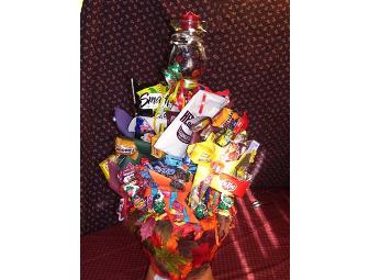 This Garden contains pinwheels filled with fun sized candy's, loose candy, lollipops, snack foods and hot chocolate mix used as a centerpiece