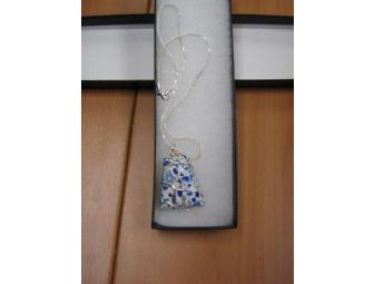 This is a hand-cut pendant made from recycled glass and concrete, hung on a silver cord. Stone size is approx. 3/4" sq. and cord is 15 1/2" long.