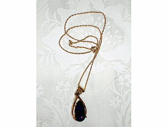 Sparkling, and royal in its purple hues, the amethyst has been loved since ancient times. The name amethyst was derived from a Greek word meaning "not drunken" because it was believed that wearing this gem would prevent inebriation. Other benefits included its ability to quicken wit, bring good luck, and keep love partners affectionate. This pretty 14kt yellow gold pendant showcases a faceted pear shaped 8.5 carat amethyst radiantly framed in a teardrop of gold. The pendant comes with a delicate 16 inch chain of 14kt yellow gold and finished with a spring ring clasp.
