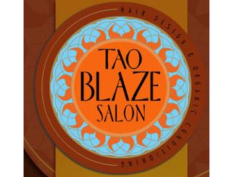 You will also be treated to Tao Blaze Saloon's signature organic hair wrap treatment, a custom blended conditioner in a steaming towel and an aromatherapy scalp massage.