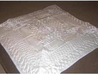 The quilt is constructed from blanket binding (which is often more durable than the blanket!) and then backed with a piece of cotton. The interior is a lt. weight quilt batting. Then it is beautifully stitched by machine with various quilting designs. It is completely washable!