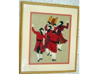 Needlepoint, Chasidic Dancers, framed 17" x 20", material 11" x 14", double matted, glass , wood frame.