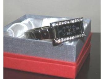 This beautiful watch has an oblong, black face surrounded by rhinestones. The band stretches with interlocking links which can be replaced with some of our Italian charm links to make your watch one of a kind!