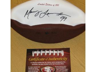 Attention Niners fans!! Don't miss your chance to own this limited edition, Manny Lawson (#99) laser autographed leather panel football. This commemorative item is not available to the general public!