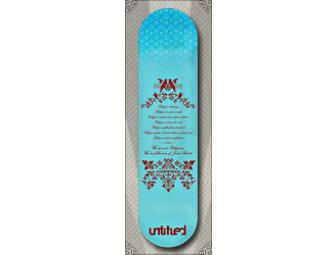This deck comes to us courtesy of Untitles Skateboards. The graphic reads: RELIGION DESTROYS. RELIGION IS MAN-MADE. RELIGION CREATES WARS UPON NATIONS. RELIGION CAUSES DIVORCES. RELIGION SPLITS FRIENDS APART. RELIGION PUTS A BARRIER BETWEEN LOVED ONES. RELIGION CAUSES CONFUSION. WE ARE NOT RELIGIOUS. WE ARE FOLLOWERS OF JESUS CHRIST.