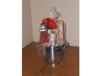 Stainless steel colander filled with Olive oil, molinari salami, pasta, chocolates, AG Ferari maranara sauce and candies. Pizza stones complete this Italian cooking basket. Available at the event!