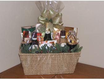 Beautiful basket filled with nuts, candies, biscuit mix, cookies, coffee mugs and good coffee, pretzels, crackers, dried fruits, smoked salmon, pistilles, caramels, pasta and sauces as well as a wood cutting board