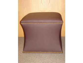 This stool boasts nail head trim and is upholostered in dark burgandy leatherette. The dimensions are 20"x20" and 18". The picture doesn't accurately depict the depth of colorl. Picture yourself relaxing with your feet up on this beautiful piece.