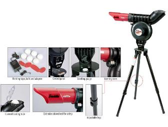 - Fully adjustable tripod-mounted 12 volt electric engine adjusts to throw ground balls and fastballs