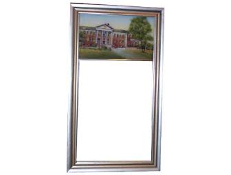 Sketch of Blaney Hall, the Administration Building, hand painted on the reverse side of the mirror (eglomise technique) suited to home or office decor. Measures 7" x 16 1/2".