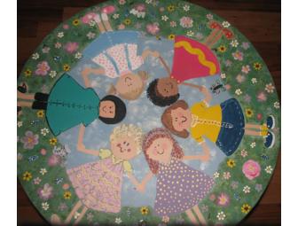 "Ring Around the Rosie" is the theme for this little girls table and chair set. The round table features six little girls playing in a field of flowers. Look closely and find some little bugs and critters hidden in the garden. The table and two chairs are hand-painted, one-of-a-kind works of art that will please any little princess.