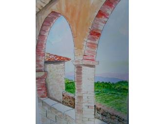 Beverly Kjeldsen has an MA in art history and taught art and art history at Ursuline High School for 18 years. She also taught art for teachers at Santa Rosa Junior College and was art consultant for Santa Rosa City Schools. Currently Bev is the illustrator for a wine and food magazine, Steppin'Out. This painting is centered in the Filsina winery in the town of Castlenuova near Sienna.