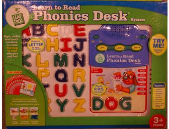 A Learn to Read Phonics Desk System from Leap Frog. Sight, sound and touch combine to make learning to read effective and fun. Includes 20 talking workd cards that teach short vowels and consonants plus 3 cards and letters that teach long vowels, complex consonants and complex vowels.
