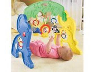 Birth & up. Busy activities and jungle friends will keep baby busy with this sturdy play gym. Rattles, crinkles, peek-a-boo mirror, and bright lights will fascinate all babies. Includes 10 removable links to mix and match and convenient carry handle.