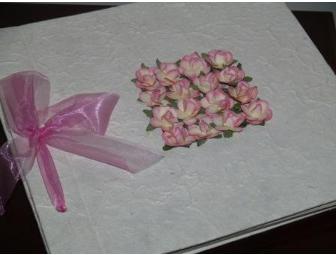 30 sheets of off-white, textured paper are enclosed in a beautiful cover with pink roses and tied with a pink bow.