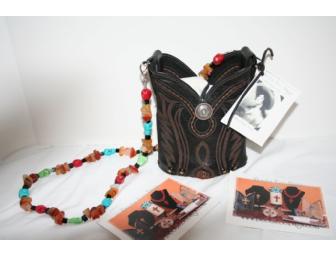 This fun brown cowboy boot purse features a colored chain made of coral and turquoise stones.