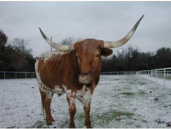 A gentle, registered Texas Longhorn Steer. Four year old son out of Bonham's Bouquet and Wizard Sire. Great horn and disposition that will offer ornamentation to any pasture.