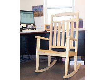 Rocker is 43" high; seat measures 22.5" wide by 18.5" deep. Made of unfinished Cyprus wood.