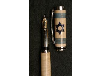 Handcrafted fountain pen by Ron Czik. Body is maple. The pen cap is made of 13 individual pieces that is laser cut to form the Israeli flag. The individual pieces, some as small as 3 mm, are carefully assembled, hand turned then finally hand rubbed to a high gloss finish. Metal fittings are platinum plated and will last for many years The medium nib is custom made from solid 14K gold with platinum accents. Pen comes with an ink converter for use with bottled inks and an ink cartridge.